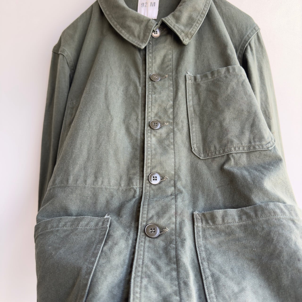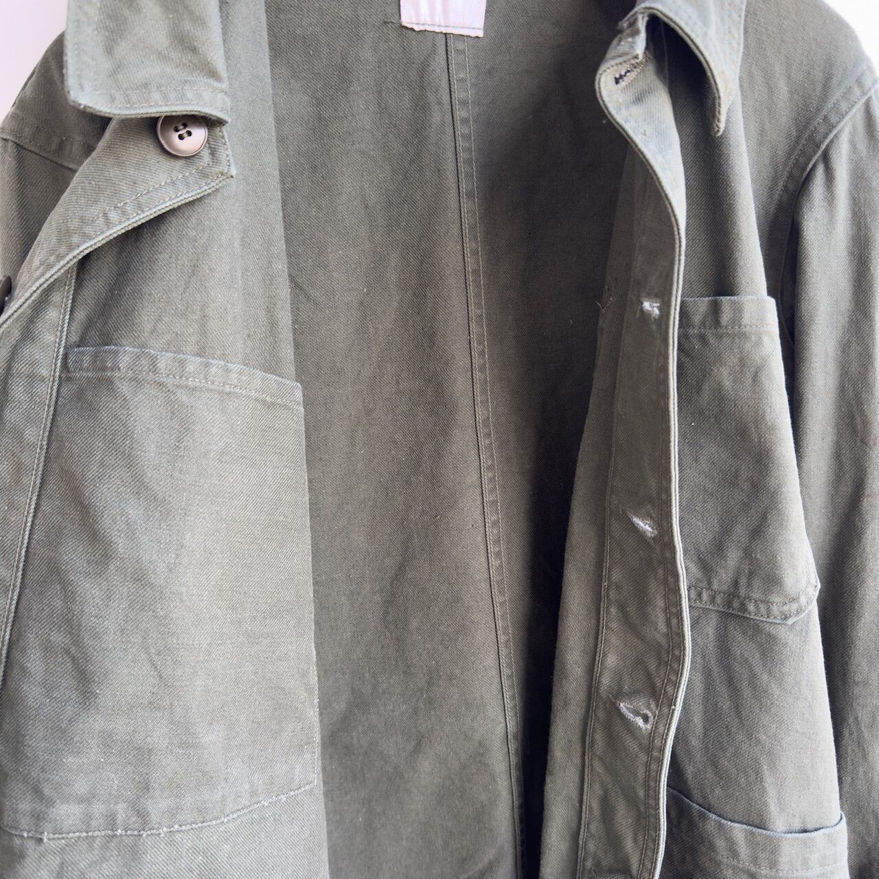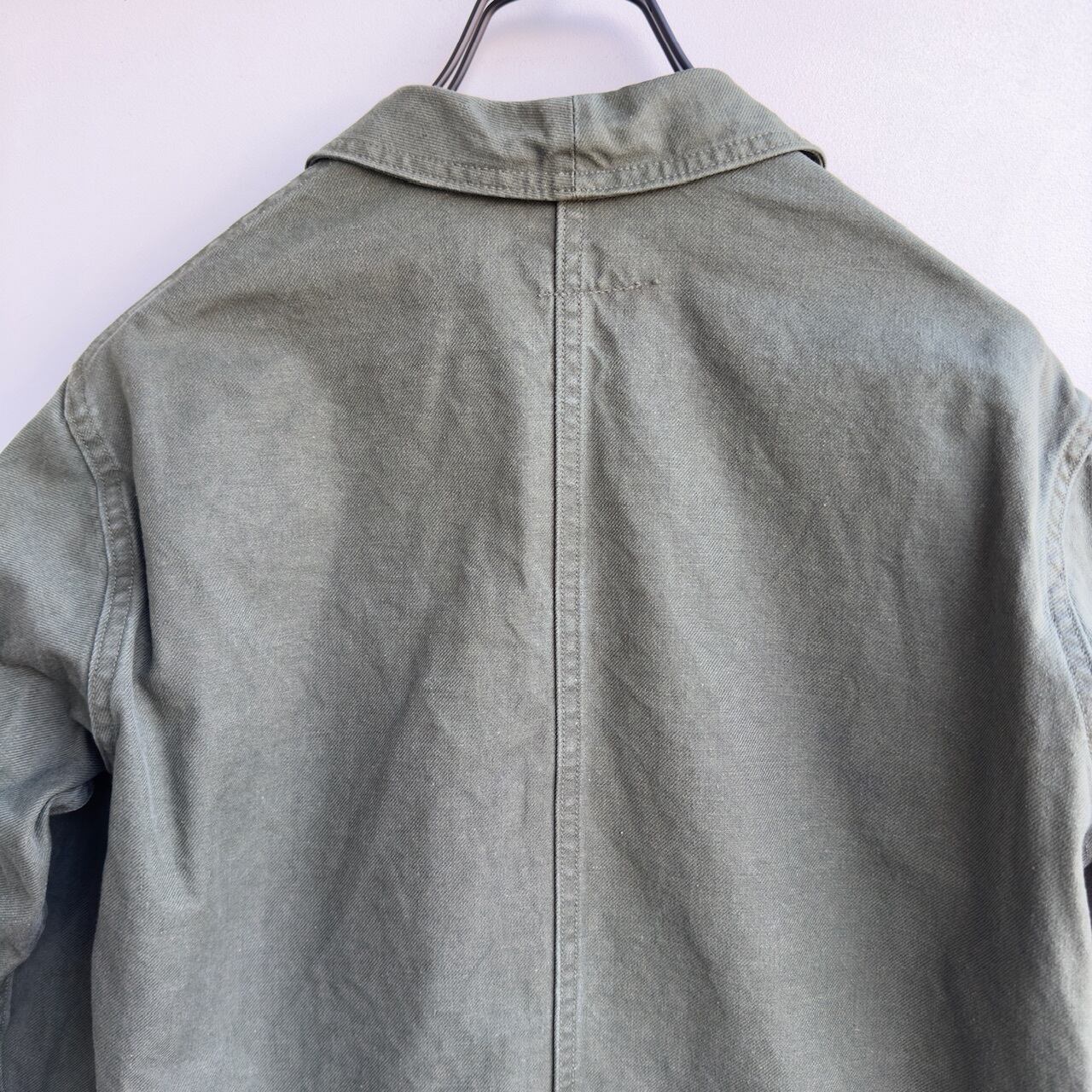 まず、フランスのワークジャケットといえば、小ぶりな丸襟、お色はインクブルーがメジャーですが、こちらは品のあるセージグリーン